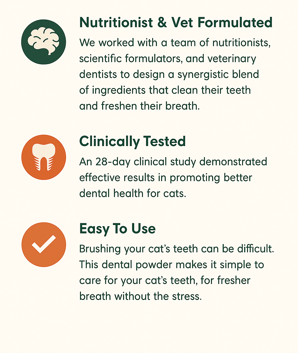 Yes—because most cats won’t tolerate brushing or chewing. Less than 5% of owners brush regularlyMarket Research_ Cat De…, and many cats swallow treats whole, defeating their purpose. Our powder works without cooperation and reaches every tooth via saliva